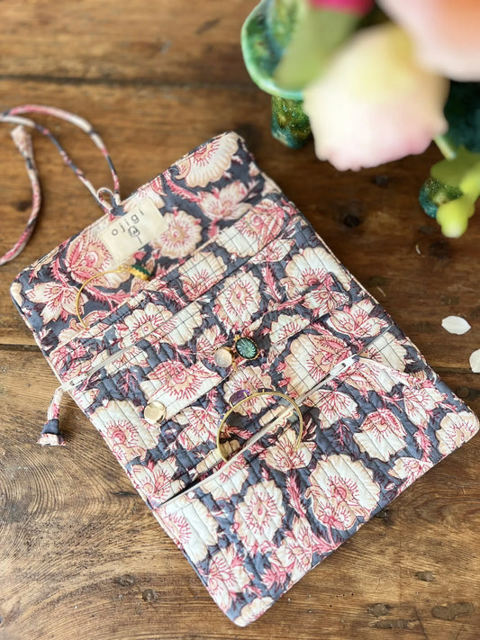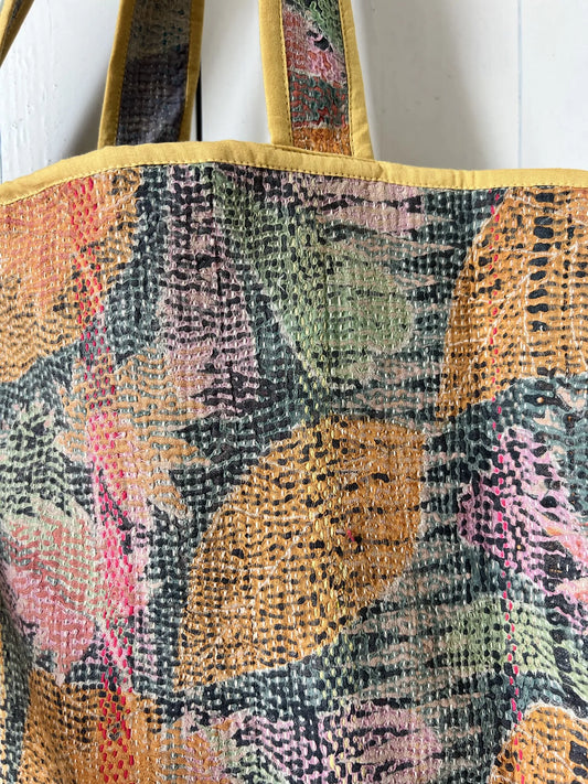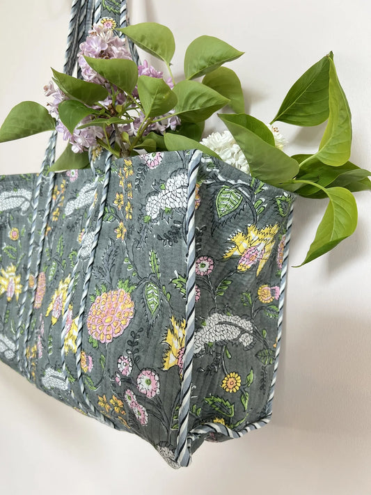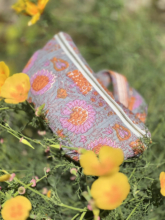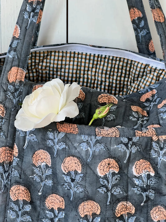 Sac week-end ESCAMPETTE coton quilté et imprimé block print - Marigold ardoise et rose orangé
