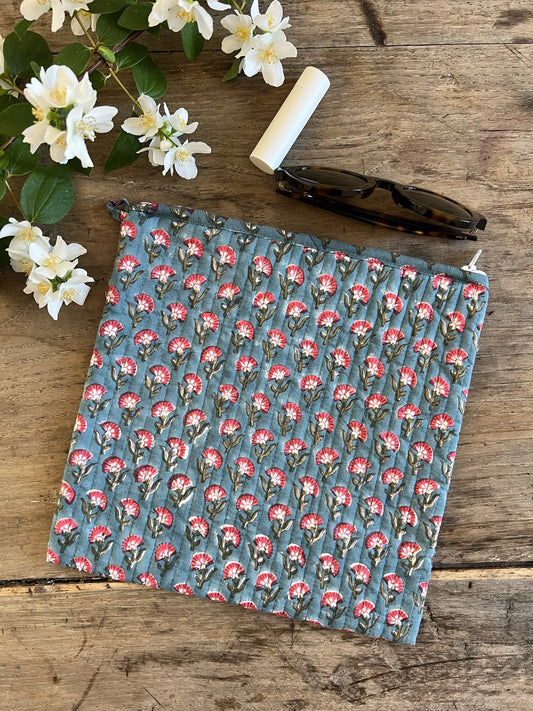 Trousse INES coton quilté et imprimé block print - bleu & turquoise