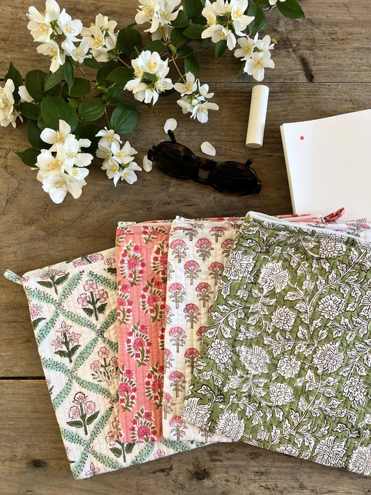 Trousse INES coton quilté et imprimé block print - vert & rose