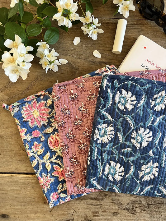 Trousse INES coton quilté et imprimé block print - bleu & rose