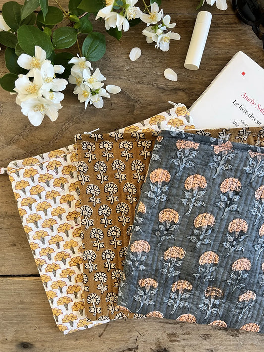 Trousse INES coton quilté et imprimé block print - ocre & ardoise