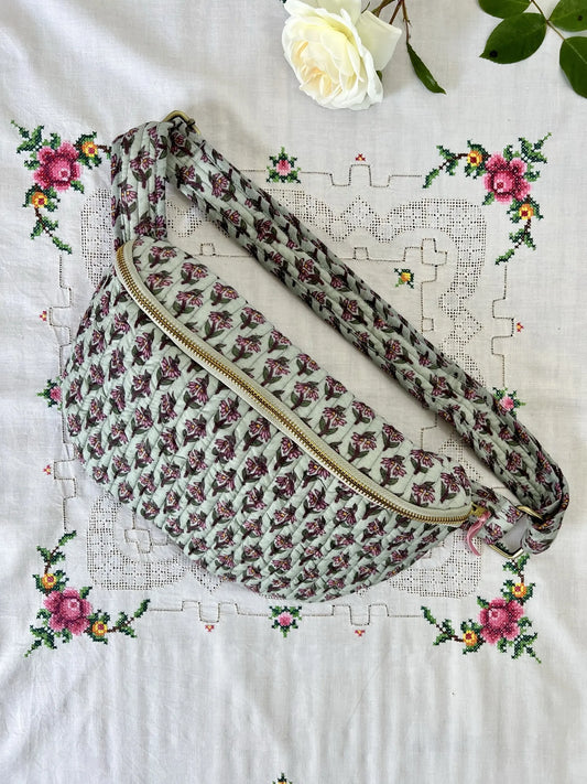 Sac banane HOLI coton quilté et imprimé block print - Cyclamen vert de gris et rose