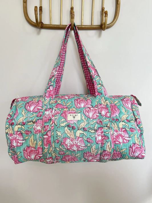 Sac week-end ESCAMPETTE matelassé et imprimé block-print - Turquoise & rose