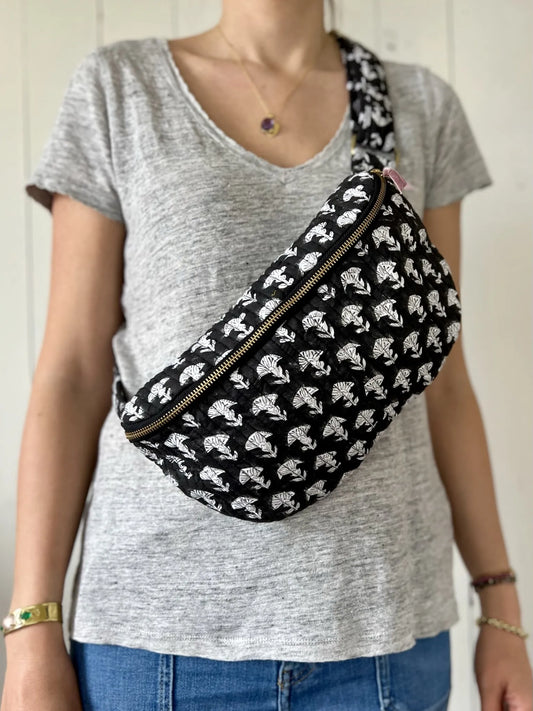 Sac banane HOLI coton quilté et imprimé block print - Œillet noir et blanc
