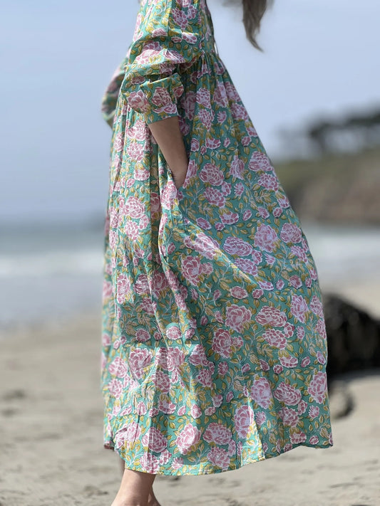Robe longue EUGENIE - Pivoine vert d'eau, vert acidulé et rose