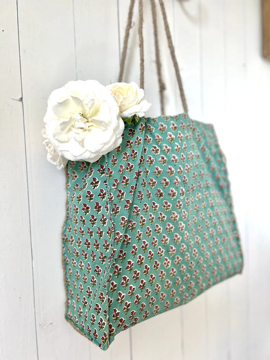 Sac BOHEME jute et coton imprimé block print - Menthe turquoise