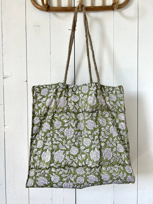 Sac BOHEME jute et coton imprimé block print - Liseron vert