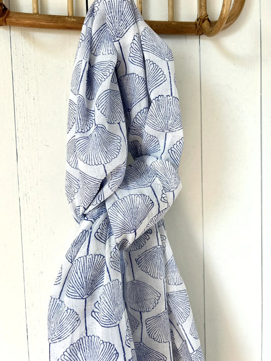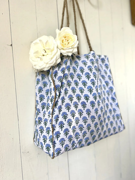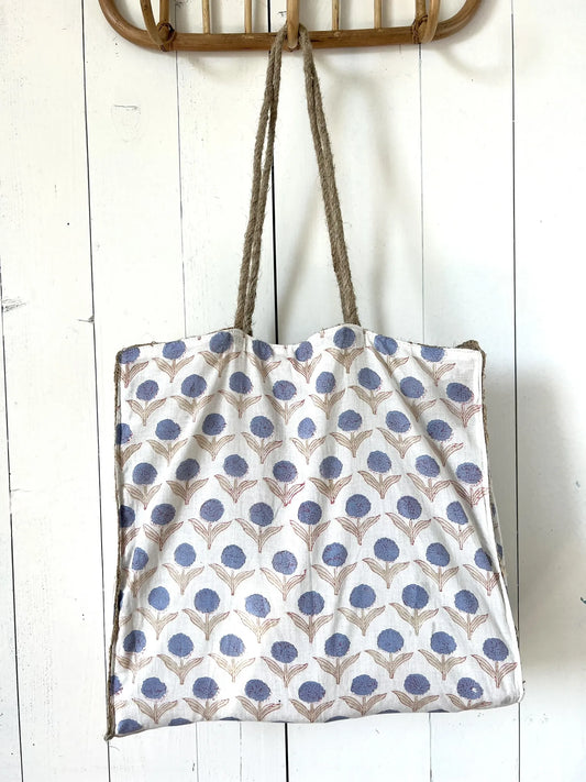 Sac BOHEME jute et coton imprimé block print - Dahlia bleu
